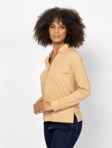 Bluză de damă cu croială dreaptă, decolteu în V cu nasturi la guler, manșete cu nasturi, material elastic ușor de manevrat, culori de bază, branding metalic mic în partea de jos, î