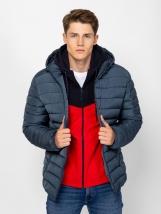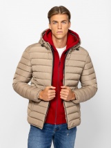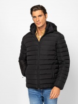 Geacă matlasată pentru bărbați cu glugă, finisaj lucios și moale, croială dreaptă și confortabilă, glugă reglabilă și detașabilă, buzunare cu fermoar la interior și exterior, branding metalic mic pe mânecă. Material: exterior: 100% poliester, căptușeală: 100% nailon, umplutură: 100% poliester. Moderat rezistentă la apă. Modelul are 188 cm înălțime și poartă mărimea L.