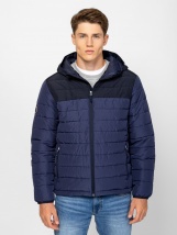 Geacă matlasată cu glugă pentru bărbați, cu un croi sportiv confortabil și culori, glugă fixă, clapetă interioară împotriva vântului, buzunare cu fermoar, buzunar interior cu fermoar, logo mic al brandului pe mânecă. Material: exterior: 100% poliester, căptușeală: 100% poliester, umplutură: 100% poliester. Modelul are 188 cm înălțime și poartă mărimea L.