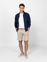 Șorturi bărbătești din pânză cu croială confortabilă, stil clasic Bermuda, buzunare frontale și la spate. Material: 98% bumbac, 2% elastan. Cureaua nu este inclusă cu șorturile. Modelul are 188 cm înălțime și poartă mărimea M.