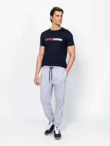 Pantaloni de jogging pentru bărbați cu talie elastică și șnur, manșete ribate și buzunare laterale. Material: 80% bumbac, 20% poliester, French Terry subțire. Modelul are 188 cm înălțime și poartă mărimea M.