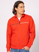 Hanorac pentru barbati cu fermoar si guler inalt, croiala clasica, mansete si tiv cu nervuri, buzunare drepte, logo pe piept si spate, banda decorativa la baza. Poarta-l cu pantalo