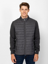 Cardigan bărbătesc cu fermoar, cu detalii tricotate și matlasate, croială confortabilă, guler matlasat, față și spate, buzunare cu fermoar, branding metalic mic pe mânecă. Material