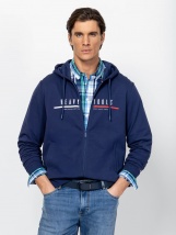 Hanorac pentru bărbați cu închidere cu fermoar, poartă-l cu pantalonii noștri ZAYDEN și ZAKURA. Material: 76% bumbac, 19% poliester, 5% elastan. Modelul are 188 cm înălțime și poartă mărimea L.