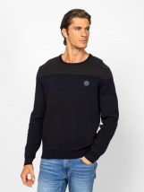 Pulover tricotat pentru bărbați cu croială clasică, modele de tricotaj captivante și dungi, guler rotund, manșete, guler și tiv tricotate cu nervuri, logo mic al mărcii pe față. Material: 100% bumbac, țesătură tricotată. Modelul are 188 cm înălțime și poartă mărimea L.