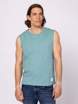 Tricou fara maneci pentru barbati, croiala confortabila, decolteu rotund, umeri lati, culori vibrante, branding tesut pe partea din fata. Material: 100% bumbac, single jersey. Modelul are 188 cm inaltime si poarta marimea L.