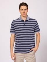 Tricou polo pentru barbati din tesatura in dungi, croiala clasica, slituri laterale, inchidere eleganta cu nasture si guler, logo mic tesut pe partea din fata si pe laterale. Parte