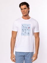 Tricou barbatesc cu maneca scurta, croiala dreapta, guler rotund, decor imprimat de mari dimensiuni cu tematica de velier pe partea din fata, eticheta tesuta pe lateral. Material:
