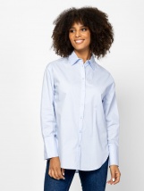 Cămașă de damă cu croială dreaptă, evazată, culori clasice, tiv rotunjit, branding metalic mic pe spate, din bumbac pur. Material: 100% bumbac, poplin. Modelul are 175 cm înălțime