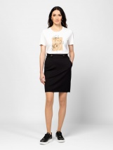 Fustă de damă cu croială dreaptă, lungime deasupra genunchiului, buzunare laterale, talie elastică, spate cu buzunare false și deschizătură, realizată dintr-un material cu vâscozitate ridicată, ușor de manevrat, cu nasturi metalici cu logo la talie. Material: 63% vâscoză, 32% nailon, 5% elastan. Modelul are 175 cm înălțime și poartă mărimea S.