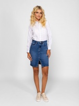 Fustă de damă din denim cu design clasic, lungime deasupra genunchiului, 5 buzunare, închidere cu fermoar, găici pentru curea, croială dreaptă, deschizătură în față, realizată din
