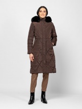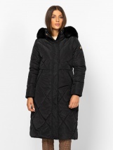 Palton de iarnă matlasat pentru femei, cu siluetă feminină, lungime până la genunchi, clapetă exterioară împotriva vântului, glugă detașabilă cu margine din blană artificială, buzunare frontale ascunse cu fermoar, branding metalic mic pe mânecă și glugă. Material: exterior: 100% nailon, căptușeală: 100% poliester, umplutură: 100% poliester, guler de blană: 100% poliester. Modelul are 175 cm înălțime și poartă mărimea S.