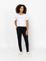 Pantaloni de jogging pentru femei cu croială confortabilă, picioare conice, talie elastică cu șnur și buzunare laterale. Material: 58% bumbac, 38% poliester, 4% elastan, French ter
