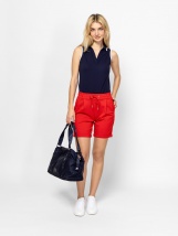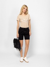 Șorturi de jogging pentru femei, lungime până la mijlocul coapsei, tiv cu manșetă, talie elastică ajustabilă cu șnur. Material: 63% viscoză, 32% nailon, 5% elastan. Modelul are 175