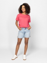 Pantaloni scurți din denim pentru femei, stil cu 5 buzunare, talie înaltă, lungime până la mijlocul coapsei, cu tiv îndoit. Material: 100% bumbac. Modelul are 175 cm înălțime și poartă mărimea S.