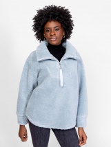 Pulover pentru femei cu închidere cu fermoar, guler înalt, croială mai largă, umăr căzut. Fabricat din material sherpa ușor de purtat, similar cu lâna, cu logo pe închiderea cu fer