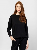 Pulover de damă cu croială lejeră, guler rotund, umeri căzuți, tiv și manșete din același material, material ușor de întreținut, capse cu logo în față, logo mic imprimat al brandului pe spate. Material: 56% modal, 38% poliester, 6% elastan. Modelul are 175 cm înălțime și poartă mărimea S.