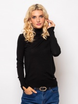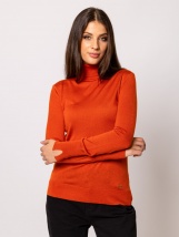 Pulover de dama din tricot fin, croiala dreapta, guler inalt, in culori clasice de toamna, branding metalic mic in partea de jos din fata. Material: 65% acril, 20% liocel, 10% lana