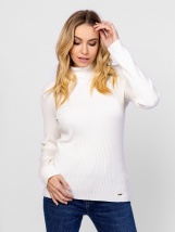 Pulover tricotat pentru femei cu guler înalt, croială mulată, model cu nervuri, branding metalic mic în partea de jos, în față. Material: 75% viscoză, 25% nailon, țesătură tricotat