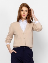 Cardigan fin tricotat pentru femei, cu decolteu în V, închidere cu nasturi și logo mic al brandului pe față. Compoziție material: 72% viscoză, 28% poliester. Modelul are 175 cm înălțime și poartă mărimea S.