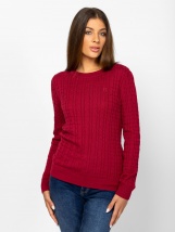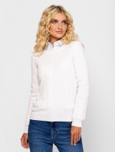 Pulover tricotat pentru femei cu croială clasică, guler rotund, model tricotat răsucit și logo mic brodat al mărcii pe partea din față. Material: 55% acril, 45% bumbac, țesătură tr