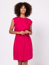 Rochie pentru femei cu maneci scurte, decolteu rotund, lungime deasupra genunchilor, talie cu curea, model interesant. Material: 100% viscoza. Modelul are 175 cm inaltime si poarta marimea S.