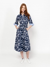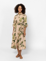 Rochie cămașă pentru femei cu mâneci 3/4, lungime până la gleznă și închidere cu nasturi. Talie ajustabilă cu curea, buzunare laterale și un mic logo pe spate. Material: 65% bumbac