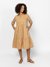 Rochie de damă cu croială evazată și adunată, lungime sub genunchi, decolteu în V cu guler, mâneci până la cot. Fabricată din material uni și cu model, cu un buzunar pe lateral și o etichetă mică de brand pe spate. Material: 65% bumbac, 30% poliester, 5% elastan. Modelul are 175 cm înălțime și poartă mărimea S.