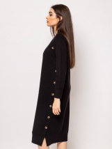 Rochie tricotata cu nervuri, croiala dreapta, lungime sub genunchi, maneci raglan, guler rotund, nasturi decorativi pe fata, in culori de baza, mic branding metalic pe spate. Mater
