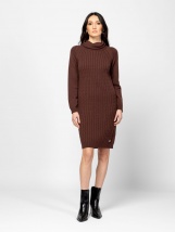 Rochie tricotată pentru femei cu siluetă feminină, model răsucit în față, lungime până la genunchi, mâneci raglan, guler înalt, branding metalic mic în partea de jos. Material: 49%