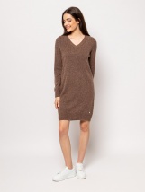 Rochie tricotata, croiala dreapta, lungime deasupra genunchiului, decolteu in V, in culori de toamna, cu mic branding metalic in partea de jos a fetei. Material: 68% acril, 12% pol