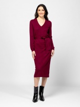 Rochie tricotată fin pentru femei, cu o siluetă feminină, lungime sub genunchi, decolteu în V, talie cu curea, branding metalic mic pe spate. Material: 75% viscoză, 25% nailon, țes