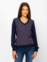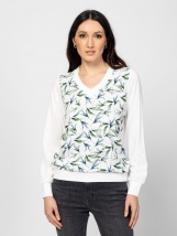 Tricou pentru femei cu mâneci lungi, croială evazată, tiv cu nervuri, față și decolteu în V, modele decorative, spate și mâneci din amestec de bumbac, față din poliester mătăsos, b