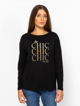 Tricou cu mânecă lungă pentru femei, cu croială mai largă, umeri căzuți, guler rotund, bumbac amestecat cu modal, imprimeu și decorațiuni cu pietre pe partea din față, branding metalic mic pe spate. Material: 50% bumbac, 50% modal single jersey. Modelul are 175 cm înălțime și poartă mărimea S.