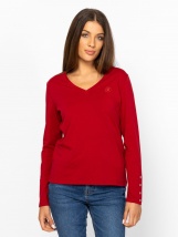Tricou pentru femei cu mâneci lungi, croială slim, decolteu în V, din bumbac amestecat cu elastan, cu un mic logo imprimat cu pietre pe partea din față și nasturi decorativi la baz