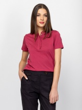 Tricou pentru femei cu mânecă scurtă, croială slim fit, decolteu cu volane și nasturi. Pe spate se află un mic logo metalic al brandului. Material: 50% bumbac, 50% modal, single jersey. Modelul are 175 cm înălțime și poartă mărimea S.Puține detalii