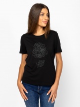 Tricou de damă cu mânecă scurtă, croială dreaptă, decolteu rotund, față cu decor de pietre și branding metalic mic pe spate. Material: 50% bumbac, 50% modal, single jersey. Modelul