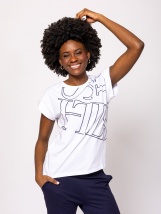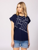 Tricou pentru femei cu maneca scurta, croiala larga, decolteu rotund, umar lasat, maneci cu guler si logo mare imprimat pe partea din fata, fabricat din material 100% bumbac. Mater