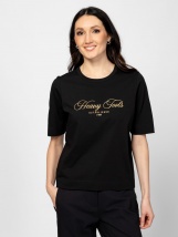 Tricou pentru femei cu mânecă scurtă, croială dreaptă, decolteu rotund, branding brodat și imprimat pe față. Realizat dintr-un fir de bumbac premium pentru o senzație moale, cu o s