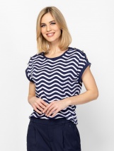 Tricou pentru femei cu mânecă scurtă, croială lejeră, guler rotund și umeri căzuți. Realizat din material în dungi cu nasturi decorativi pe umeri. Material: 50% bumbac, 50% viscoză... Mai multe detalii