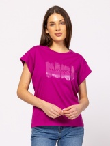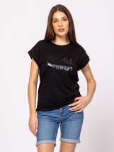 Tricou de damă cu mânecă scurtă, cu croială dreaptă, cu umăr căzut, mâneci cu rever, din bumbac pur, cu logo-ul mărcii imprimat pe fa?ă. Material: 100% bumbac, jerseu simplu. Model