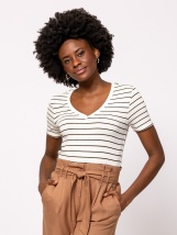 Tricou pentru femei cu maneca scurta, croiala usor slim, decolteu in V, tesatura subtire din bumbac amestecat cu elastan si modal, cu fir lurex, logo tesut pe lateral. Material: 57