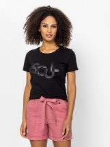 Tricou pentru femei cu mânecă scurtă, croială slim fit și guler rotund, cu un imprimeu decorativ pe față. Material: 95% bumbac, 5% elastan, single jersey. Modelul are 175 cm înălțime și poartă mărimea S.Puține detalii