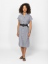 Rochie cămașă pentru femei, lungime sub genunchi, închidere cu nasturi, talie ajustabilă cu o curea. Mâneci scurte, umeri căzuți, buzunar lateral, realizată din material cu model.