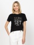 Tricou pentru femei cu mânecă scurtă, croială regular fit, guler rotund, cu imprimeu decorativ pe față. Material: 100% bumbac, slub jersey. Modelul are 175 cm înălțime și poartă mărimea S.
